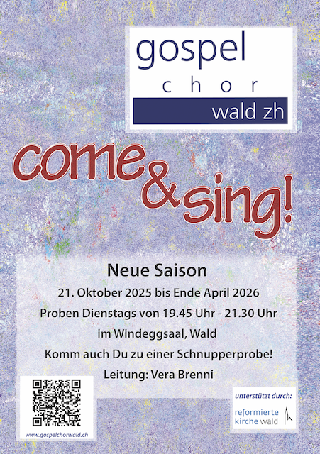 Der Gospelchor Wald startet am Dienstag, 21. Oktober um 19.45 Uhr in seine 28igste Saison. Alle sind herzlich willkommen! Der Vorstand freut sich auf viele bisherige und neue singbegeisterte Gospelsängerinnen und Gospelsänger. Vorkenntnisse sind keine nötig. Die Freude am Singen genügt! Die Proben für den Projektchor sind jeweils dienstags von 19.45 Uhr - 21.30 Uhr in der Windegg in Wald ZH. Höhepunkt sind unter anderen die zwei Konzerte am 19. und 26. April 2026.