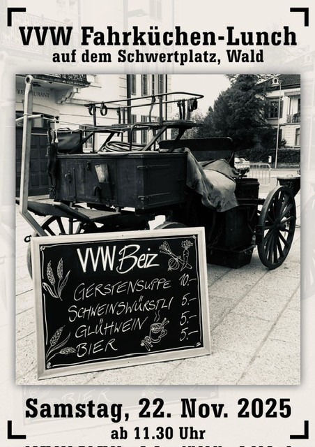 Es wird wieder gekocht mit der legendären Militärfahrküche des Verkehrsvereins Wald. Geniessen aus den mit Holz beheizten Kochkesseln mit Gerstensuppe, und Schweinswürstchen. Dazu einen Glühwein oder ein anderes Getränk !